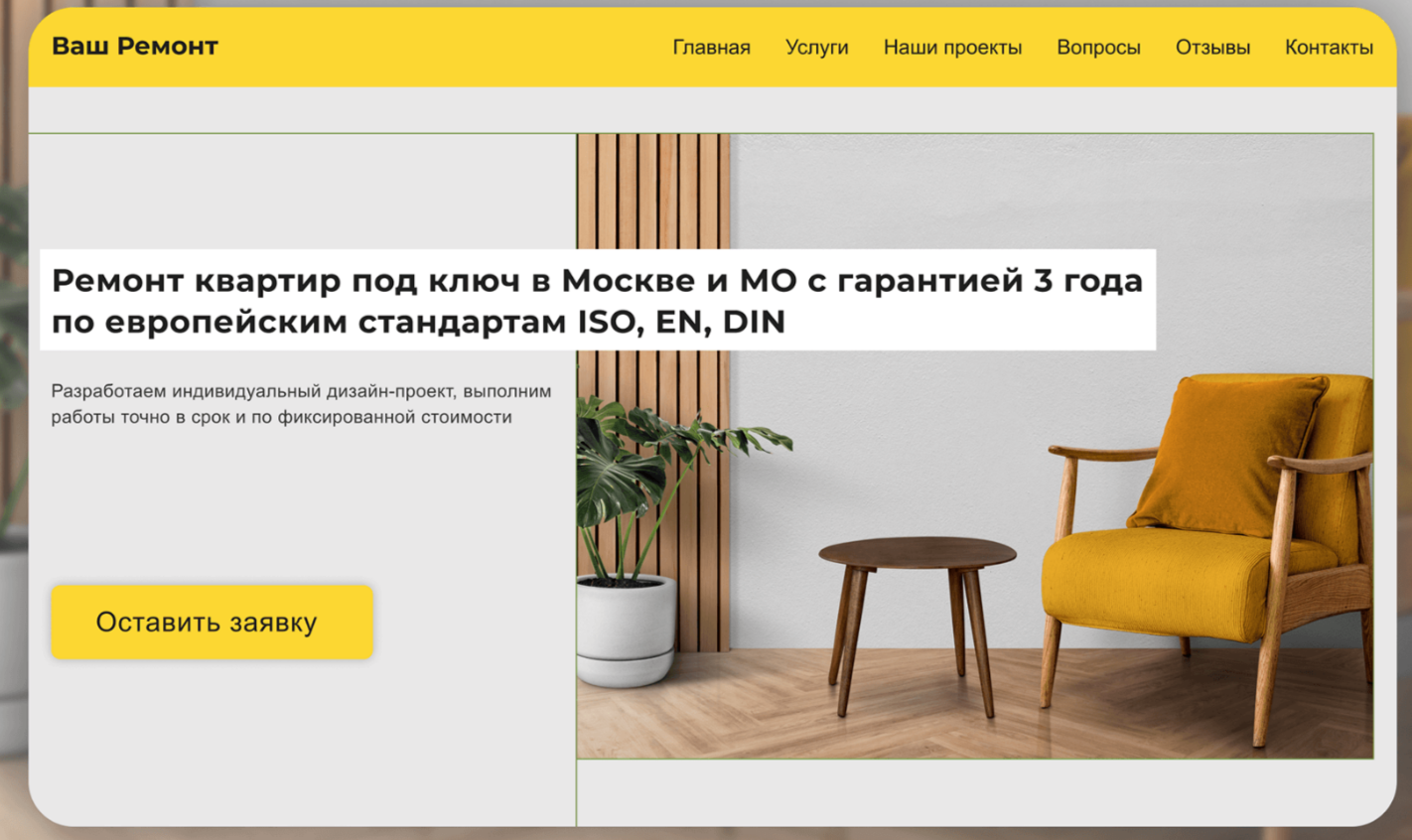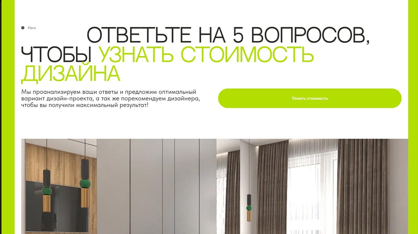 Для повышения вовлеченности был разработан квиз. В квизе всего 5 вопросов, которые наиболее интересуют клиентов при ремонте квартир и помогают снизить стоимость заявки.