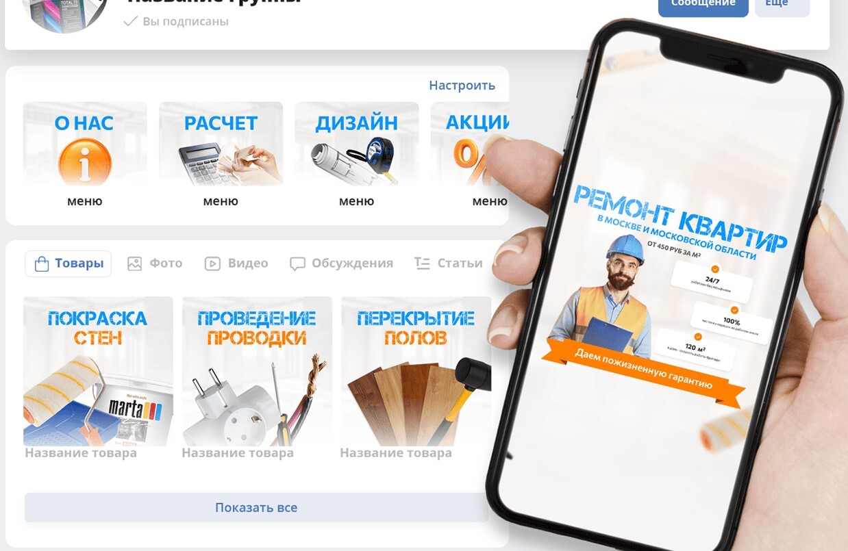 Дизайн оформление Вконтакте для сообщества по ремонту квартир. Бал выполнен дизайн обложек ПК, оформлениеменю и улусг.